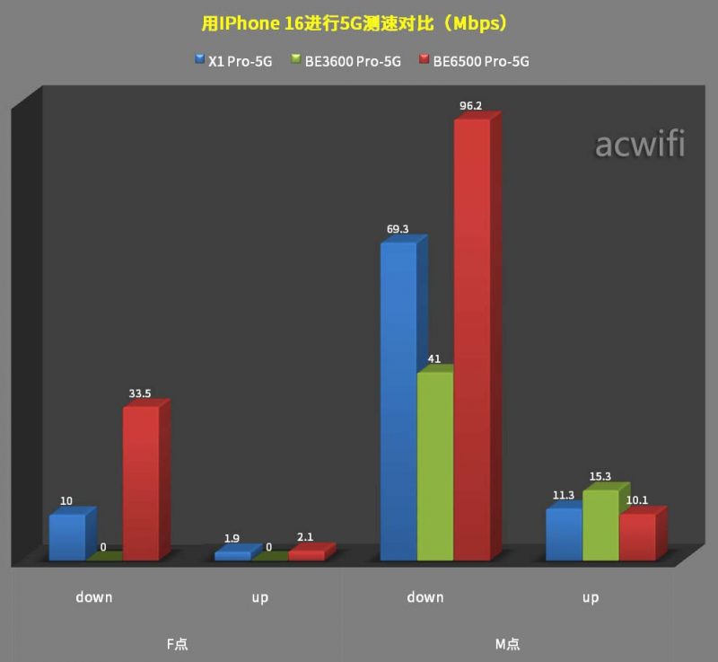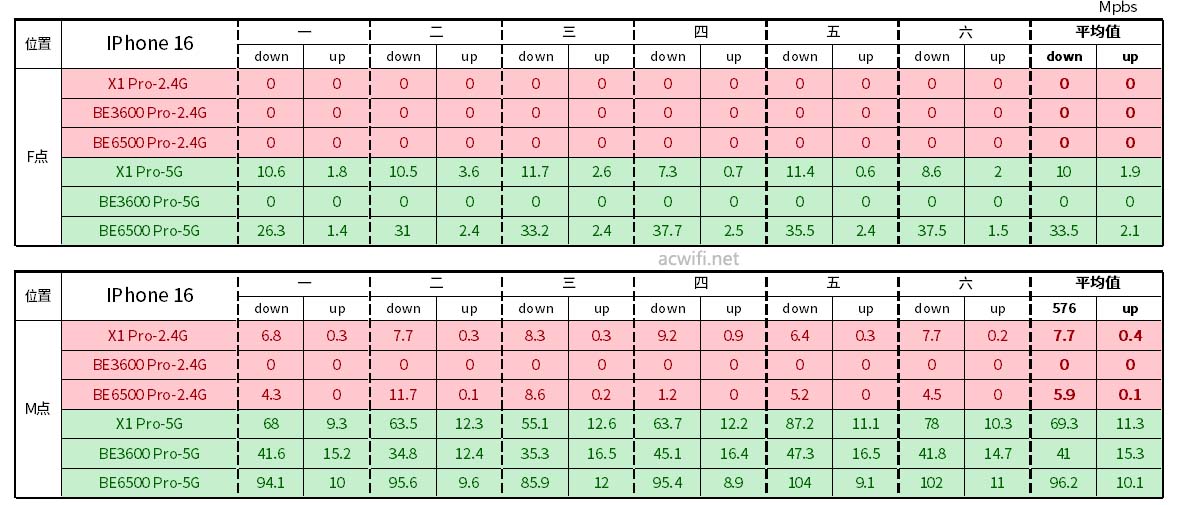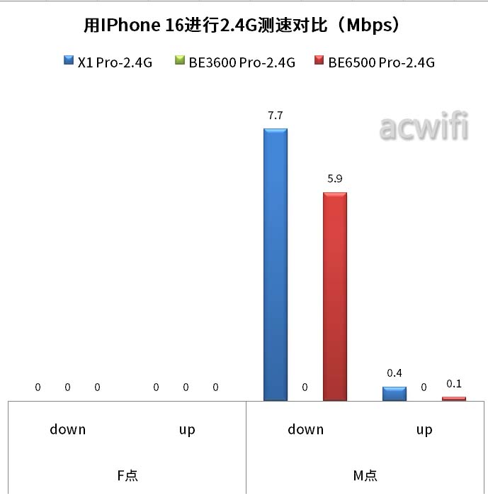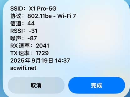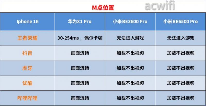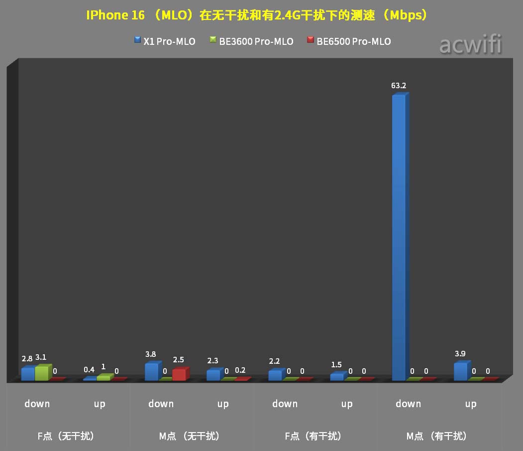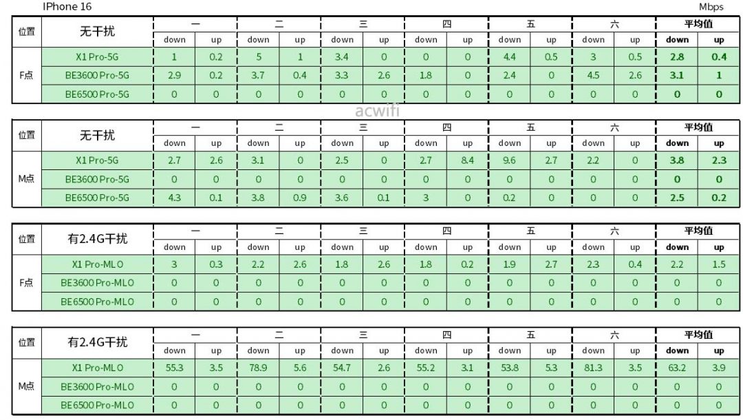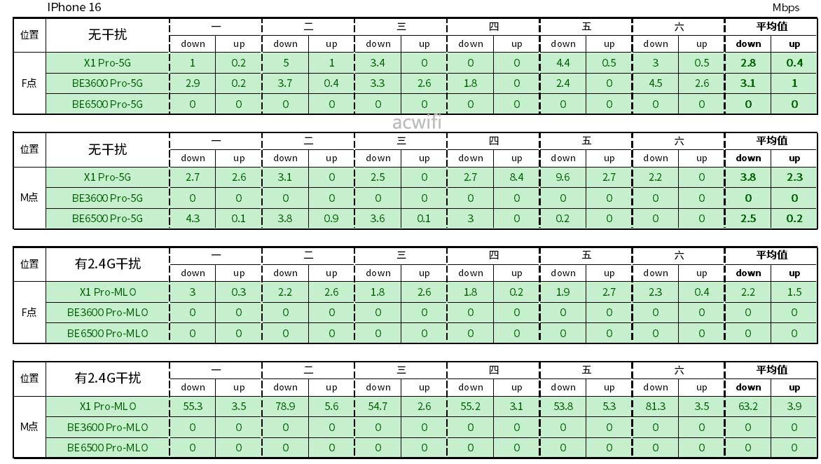 IPhone 16连接华为X1 Pro MLO,在M点位置有强2.4G干扰情况下,受影响最小,因此速度明显相比连接小米BE3600 Pro和小米BE6500 Pro快得多。
