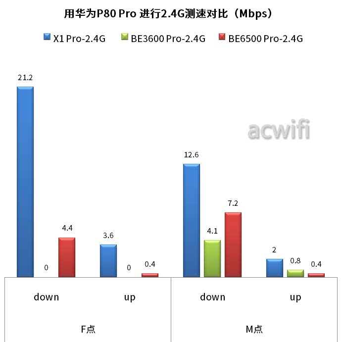 从上图来看,在F点位置三者都没有2.4G速度,在M点位置,华为X1 Pro比小米BE6500 Pro的2.4G速度要快一点点,而小米BE3600 Pro的2.4G也没有速度。