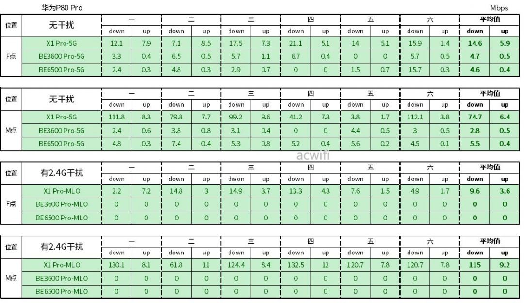 MLO传输速度测试分为两种情况,一是在没有2.4G强干扰的情况下,二是在有2.4G强干扰的情况下。为了方便对比,我把同一款手机测得的无干扰与有干扰数据放在一起。