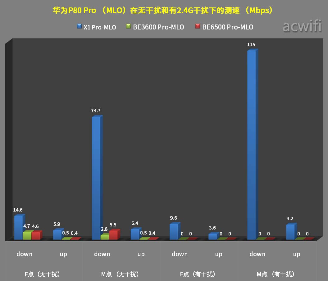 华为P80 Pro连接华为X1 Pro在M点无干扰和有干扰下情况都最佳,且比IPhone 16 表现更好。