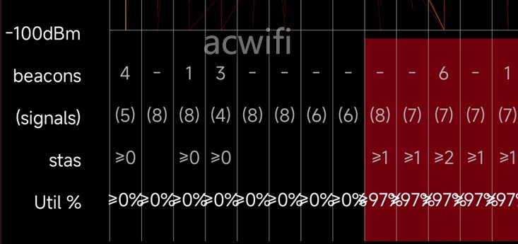 用winfi、analiti或其它能看见信道占用率的工具就能清楚看见,比如这样:(97%)