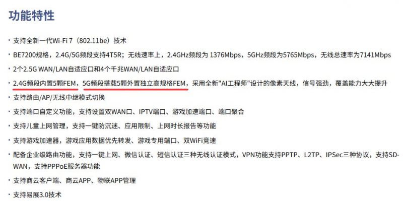 然后就是FEM方面的差别,上图表里面只说明了7DR7290是10颗外围顶配的独立FEM,即10颗外置FEM,而7DR7230没有说明清楚,但在官网的商品介绍页面就有明确写出了,7DR7270的2.4G是用内置的FEM,5G是用外置的FEM。