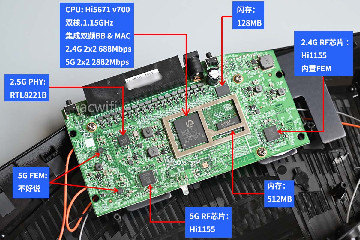 说回海思Hi5671 v700,随着拆机看见的东西越来越多,一些之前说的信息未必对,之后说的也不一定对。我觉得芯片封装牛乸那么大,里面肯定有不少的东西,比如能放下双频Wi-Fi 7 无线基带。即: