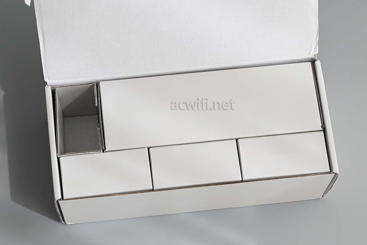 把套装里的东西都取出来,长条的主路由和三个86面板式的子路由: