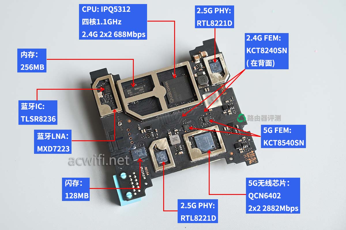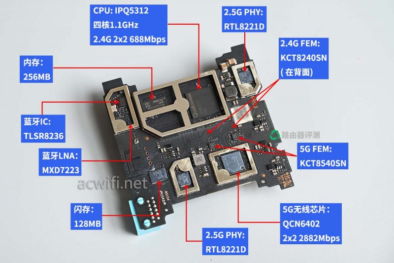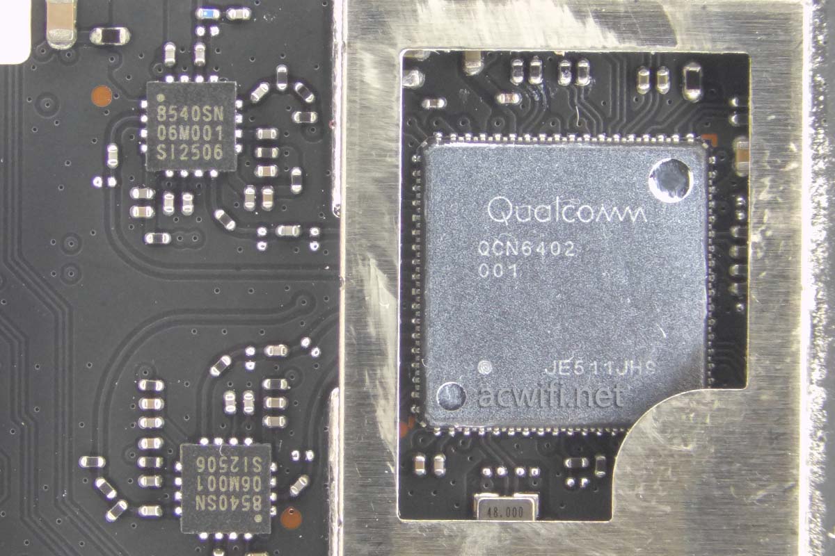 5G无线芯片是高通的QCN6402,支持2x2MIMO,在160MHz频宽和4096-QAM下,最高无线速率是2882Mbps。