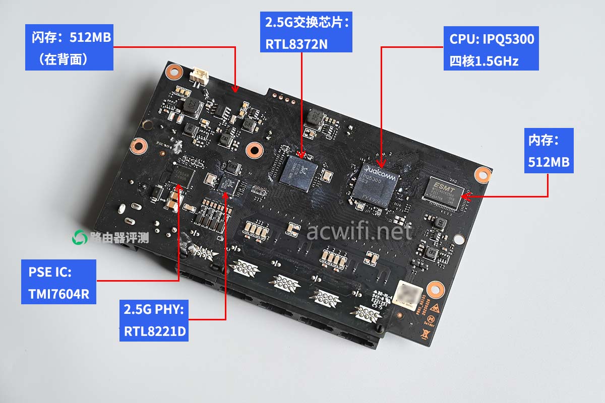 小米BE3600Pro网线版主机的CPU型号是IPQ5300,四核A53,最高频此率1.5GHz,由于5300末位不是2,所以没有集成2.4G 无线Wi-Fi,即没有集成无线功能。其它参数跟其实IPQ53x2系列(或叫Dragonwing N7)差不多。