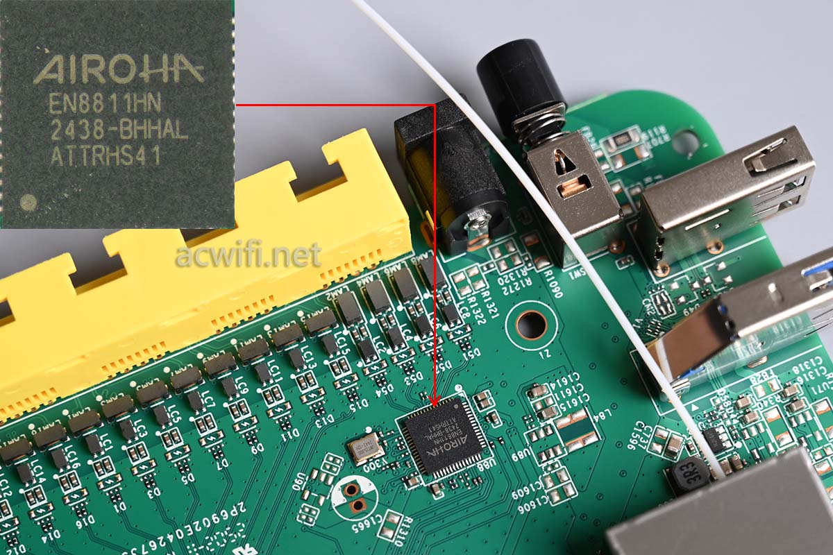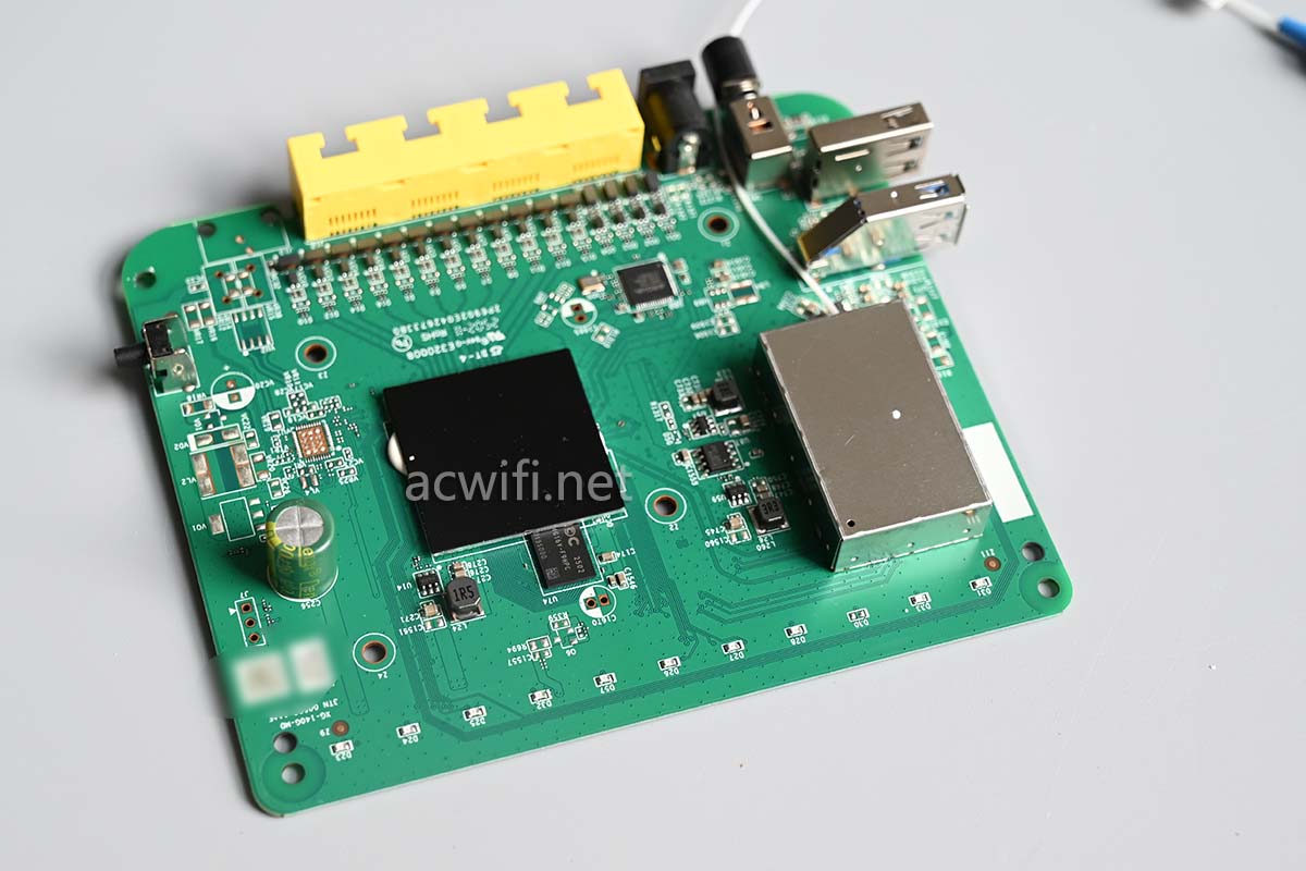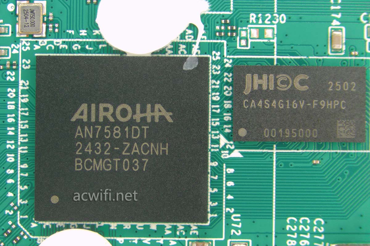 CPU是AN7581DT,四核A53,频率1.2GHz,T代表扩展内存.而内存芯片是CA4S4G16V-F9HPC,DDR4-2666,容量512MB,国产晋华的内存颗粒。