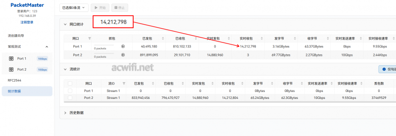 测试小包转发率用的工具是PacketMaster。实测7DR7299的64字节包转发率为14.21Mpps,跟高通IPQ9570测出的14.32Mpps非常接近。