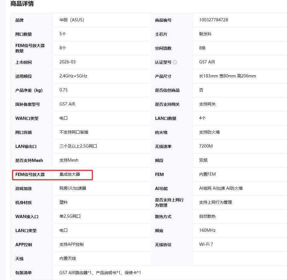 如果你不信我的话也没问题,你可以查看京东商品页里面的商品详情,里面的一项“FEM信号放大器:集成放大器”。当然我不并说是集成的信号不好,联发科的BE7200就算用内置的FEM也很不错的。
