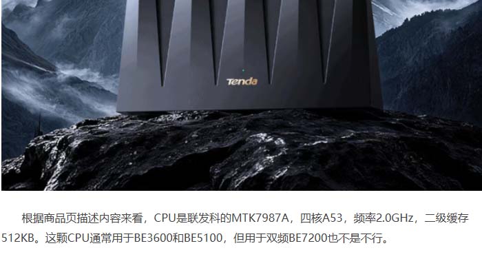 记得我在腾达泰山BE7200 Ultra的文章里说过“这颗CPU通常用于BE3600和BE5100,但用于双频BE7200也不是不行。”今天还真是看见MT7987A用于BE7200身上。