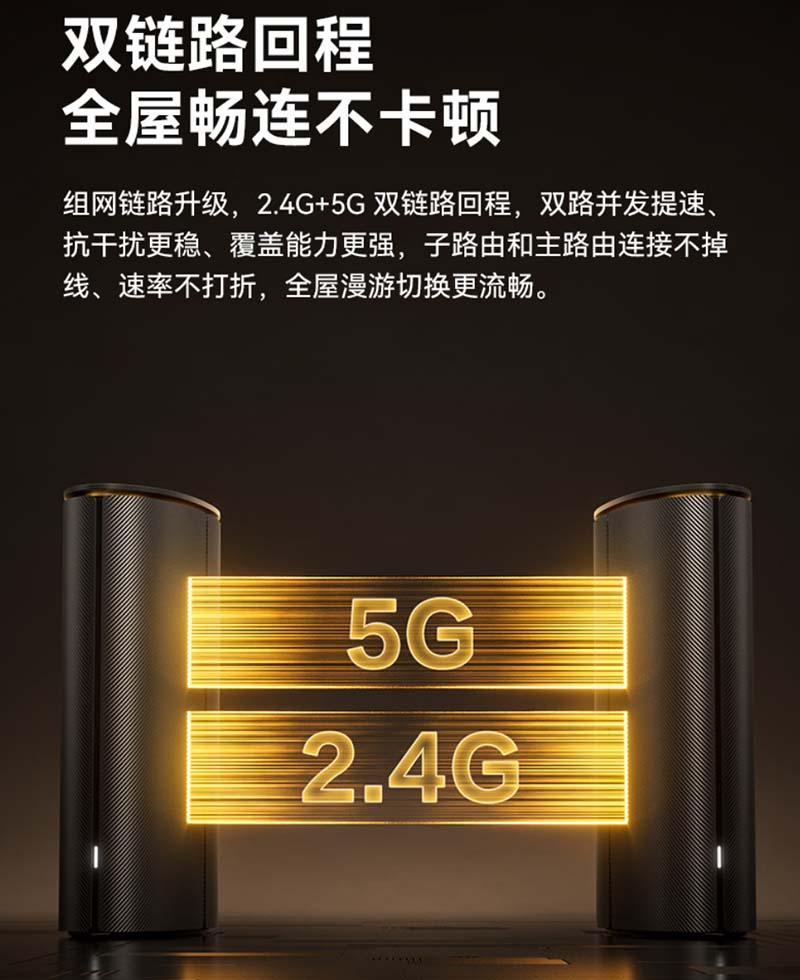 组网链路升级,2.4G+5G双链路回程,双路并发提速、抗干扰更稳、覆盖能力更强,子路由和主路由连接不掉线、速率不打折,全屋漫游切换更流畅。